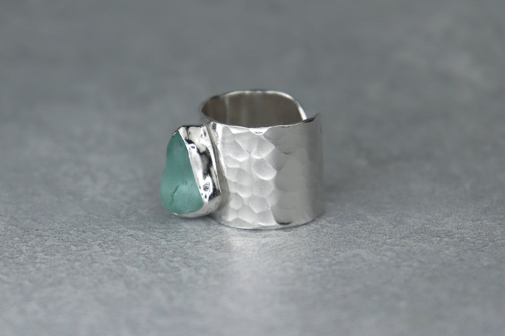 The sea glass is in a sterling silver bezel on a hammered 15mm wide band. The ring is UK size L